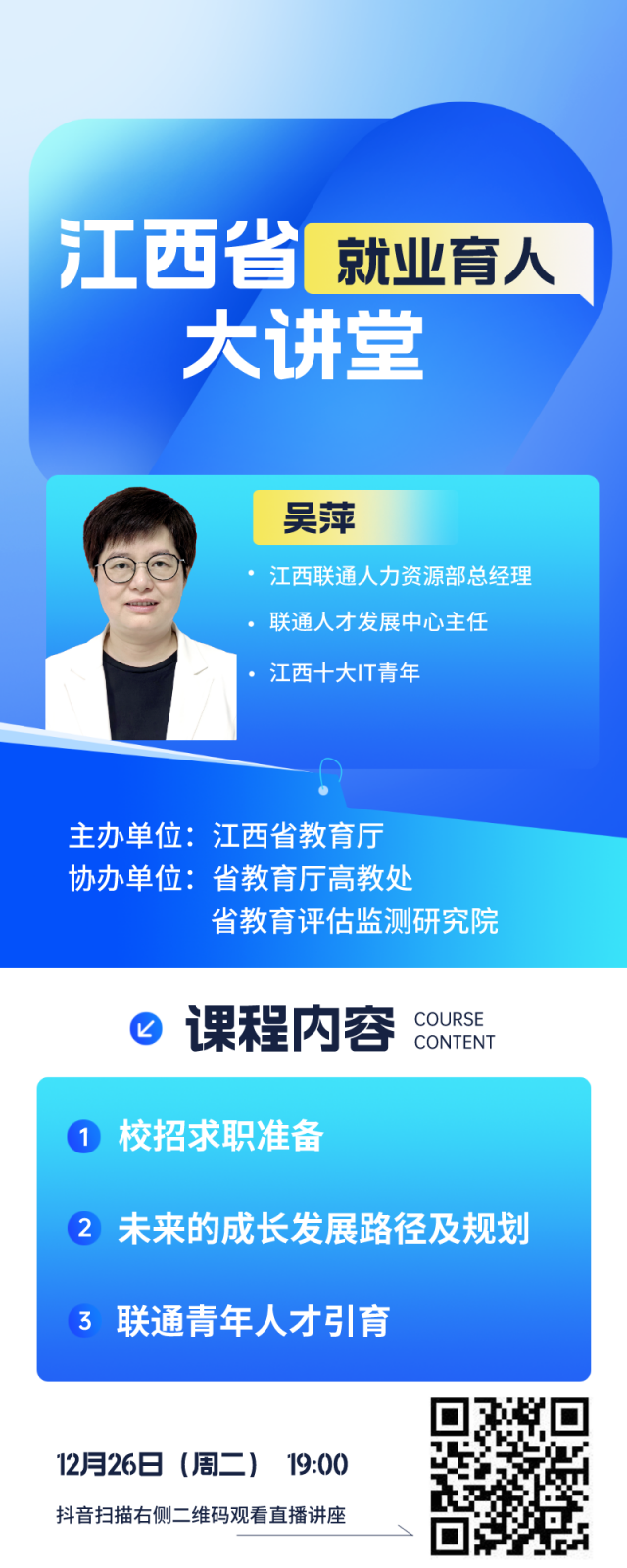 各系:2024届江西省就业育人大讲堂第十二期将于本周二晚上(12月26日)19:00开讲,本期主题为:职场小白的成长进阶路径,请各高系组织本系师生准时上线观看[抱拳]观看方式:抖音扫描上图右侧二维码签到预约观看
