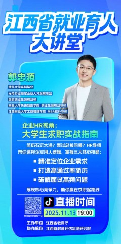 江西省就业育人大讲堂本学年第二期将于明天(周四)晚上7:00开讲,本期邀请到光电行业领军企业人才发展总监、国家职业生涯规划师郭忠源老师,以《企业HR视角:大学生求职实战指南》为主题进行直播授课,请各系极组织学生抖音扫码预约观看