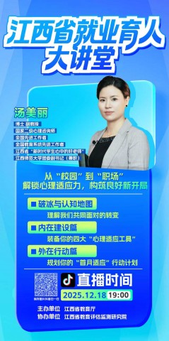 江西省就业育人大讲堂本学年第六期将于12月18日(本周四)晚上7:00开讲,本期邀请到全国先进工作者、国家二级心理咨询师、江西师范大学汤美丽老师以“从“校园”到“职场”:解锁心理适应力,构筑良好新开局”为主题开展直播授课活动。请各系积极引导学生通过抖音扫码,预约观看。